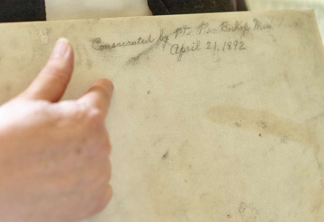 There, written in pencil on the back of the stone was the date of consecration by Bishop Meerschaert. Sister Julie Marie then opened to a page in the late historian Father James D. White's book,