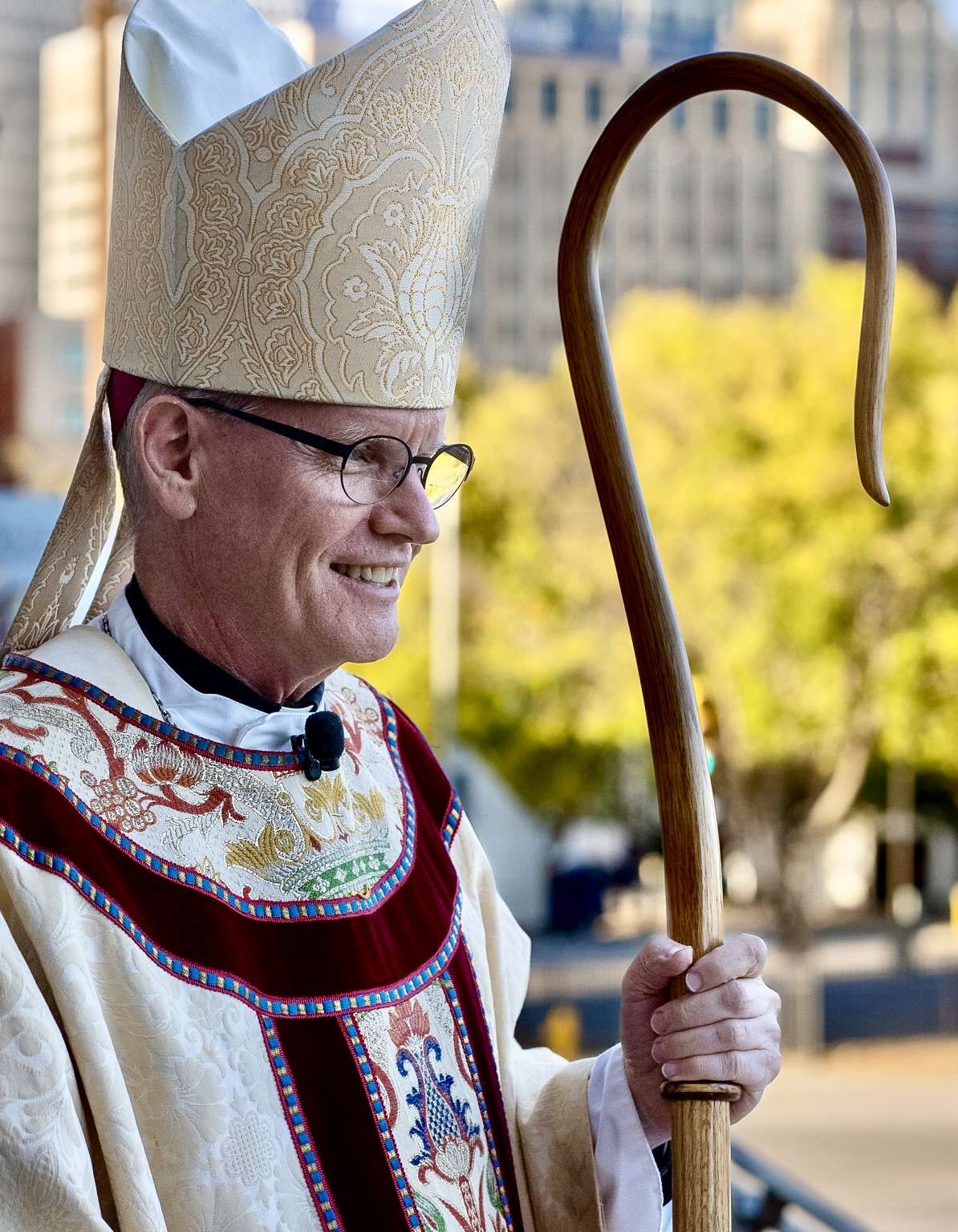 Diary of a Frontier Bishop, to Bishop Meerschaert's journal entry at the time. "Let me see, 21, April 1892 — it says he was in Guthrie. 'I consecrated 41 altar stones. Started at 6:45 and finished at 12:10, said Mass.'"